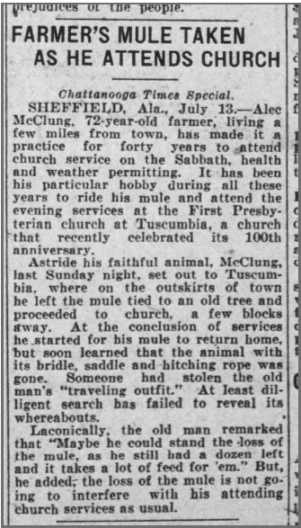 - 1879 - read a letter from a visitor to the church describing a typical Sunday morning worship service, published in The North Alabamian