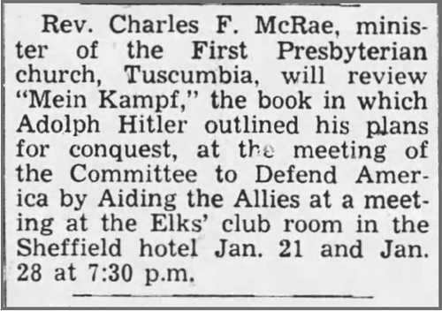 - 1940 - a congregational meeting adopted a resolution reaffirming opposition to any possible union of the Northern and Southern Presbyterian Churches (which was in discussion at the General Assembly but ultimately rejected).
